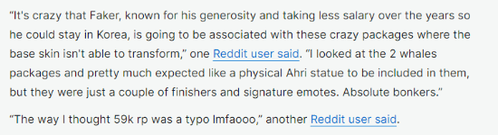 价格在公布后引起了无数外网玩家的不满,Reddit的许多玩家纷纷说道:“Faker以慷慨著称,为了留在韩国,他多年来一直拿着更少的薪水,现在却要和这些疯狂的包装捆绑在一起,这太疯狂了。”“我看了看,还期望它们包含一个实体版的阿狸雕像,但它们只是几个签名和表情。绝对疯狂。”“我还以为这价格是拳头打错字了。”