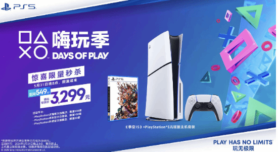 自2024年5月31日晚8点起至2024年6月18日止,PlayStation天猫官方旗舰店和PlayStation抖音官方旗舰店销售的次世代家用游戏主机PS5轻薄版光驱标准版惊喜价3,299元,数字版2,699元;虚拟现实设备PlayStation VR2优惠至3,799元;DualSense™无线控制器仅售449元,多色可选。