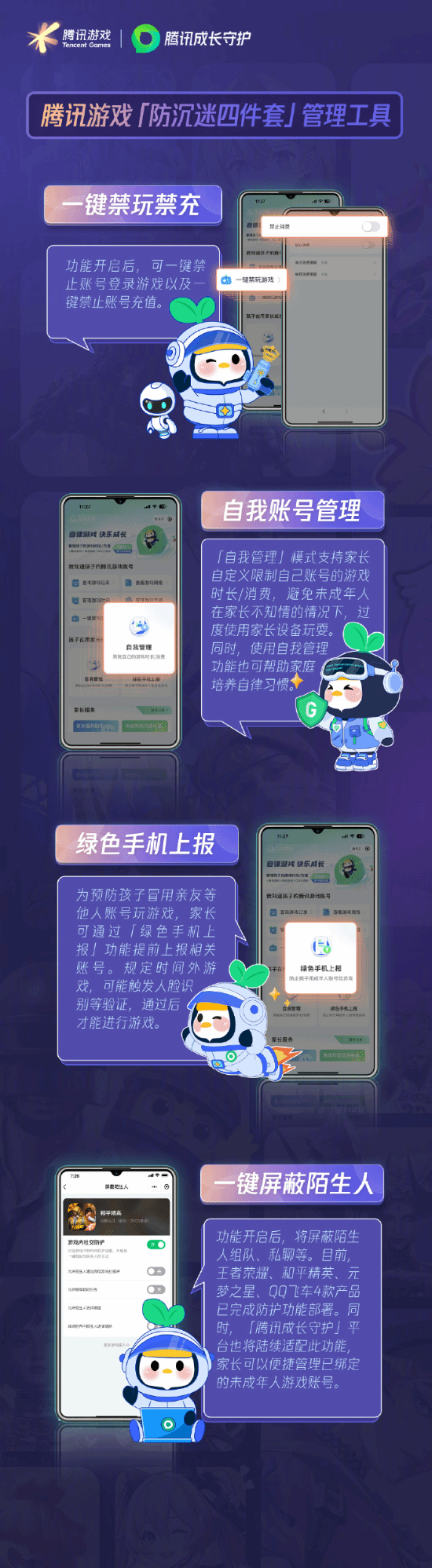 今日,腾讯游戏宣布全新升级“防沉迷四件套”管理工具,涵盖“一键禁玩禁充”“自我账号管理”“绿色手机上报”以及“一键屏蔽陌生人”四大功能。