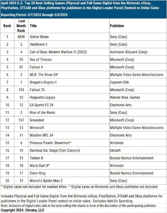据数据机构Circana(NPD)执行董事Mat Piscatella公布的数据,《剑星》是4月份整个美国最畅销的游戏,位列第一!