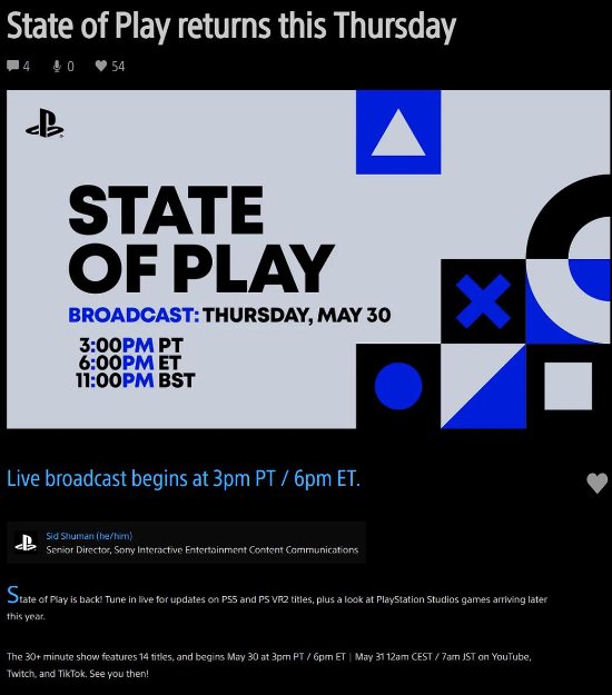PlayStation博客官宣,索尼将于北京时间5月31日早晨6点举办State of Play展会,时长30多分钟,将介绍14款PS5和PS VR2游戏的更新,其中包括今年晚些时候推出的PlayStation Studios第一方游戏。