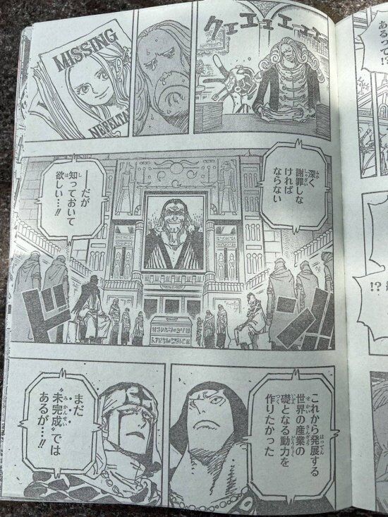 本话紧接着上一话,出现了世界各地的人们对贝加庞克话的反应。人们在问那场800年前的战争的情况。人们问道:“800年前的战争还在继续!?在哪啊!?但是那个时代的人都已经不在人世了!! 为什么一场无人知晓的战争还在继续!?贝加庞克!!”