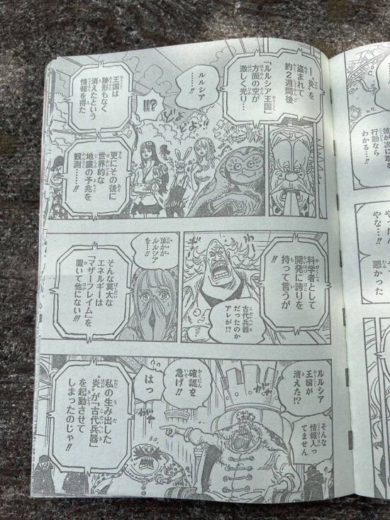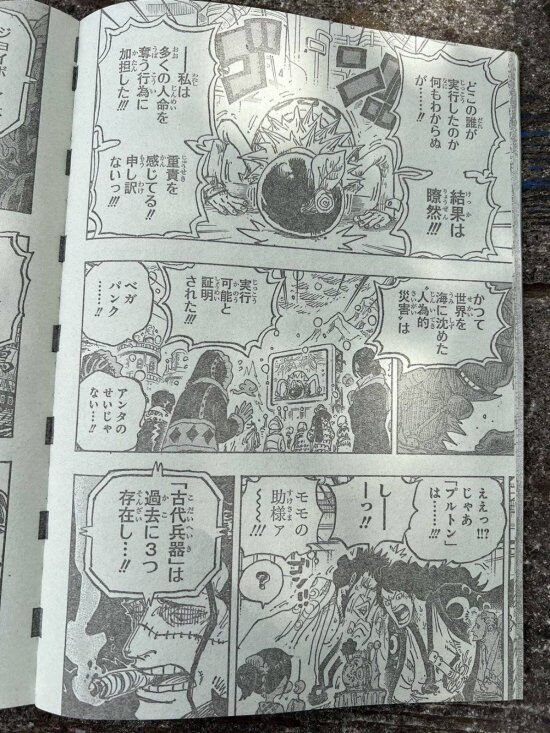 贝加庞克透露道,他意识到一小部分“母火种”被盗取,它被用来为一种“古代兵器”提供燃料(当他谈到“古代武器”时画面出现桃之助和克洛克达尔)。