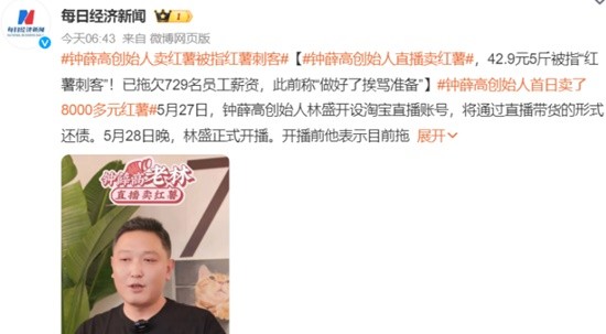 开播前他表示目前拖欠729位员工薪资,直播赚钱后将逐步还钱给员工,背景板写着“钟薛高老林直播卖红薯”与数字“729”。“先把拖欠的员工薪酬还上,感谢他们至今一路风雨与共。”林盛也坦言,“做好了头俩月挨骂的准备”。