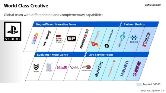 在周三的索尼业务部门会议上,官方公开的演示文稿中展示了索尼对旗下游戏工作室业务领域的划分以及其IP所扮演的角色。