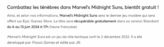 据透露,《漫威暗夜之子》的标准版本将于6月6日至13日在该平台免费提供。已经确认的《骑士精神2》仍可在6月6日前免费领取,感兴趣的玩家不要错过。