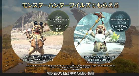 《荒野》中依然有多种多样的地形要素,新骑乘动物鹭鹰龙会成为玩家们的同伴,帮助自由探索,是非常重要的角色。另外,作为新公开的情报游玩《怪猎世界冰原》的玩家可以在《荒野》中领取随从装备,游戏计划发布相应的保存数据特典。