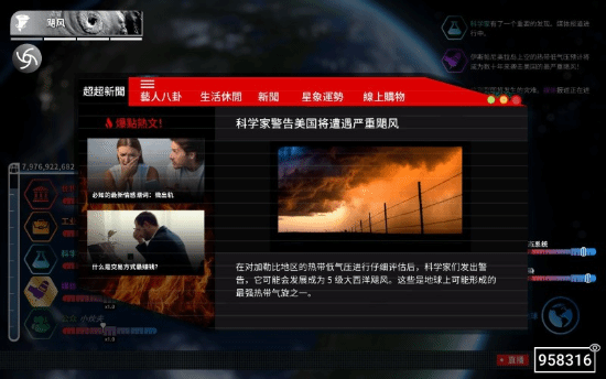化灾难为武器的地球作为一款非对称对抗游戏,你可以选择成为拥有毁天灭地力量的地球同时对抗其他的五位玩家,地球的获胜标志是让世界人口清零,所以地球的唯一目标就是发动包括火山喷发,蝗群,释放传染疾病或者引导小行星撞击地球引起气候变化等自然灾害从破坏人类的生存环境,社会经济和医疗系统等多个维度把地球变成一个人类无法生存的天体。作为地球你也可以制定一个精密的计划在游戏的不同阶段精准打击某一人类派系,利用挑起人类之间的矛盾彻底分化瓦解他们。