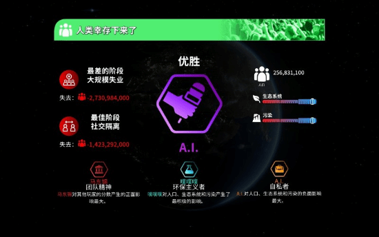 但所有的决定都会最终影响人类的生存,所以在独赢背景下,人类派系需灵活运用策略平衡合作与竞争,以提升自身实力和影响力,每个人类派系的决定都直接影响自己在游戏内积分排名,这些决定往往需要在道德和利益之间做出抉择, 每个人类派系都有自己的独立任务和挑战;科学家可以为对抗自然灾害提供技术帮助,但又依赖资金维持科研开发,媒体可以利用舆论安抚人心或者煽动恐慌情绪;公众拥有是否接受并执行各方给出的方案的选择权;世界领袖可以制定并推行制约性的政策和法律;工业大亨则需要在环境保护和成本效益之间做出平衡.