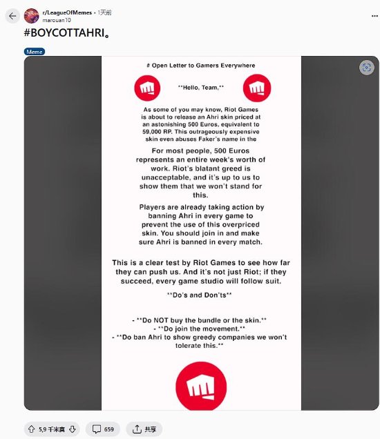 这封请愿信写道,这款皮肤500美元/欧元的价格实在是贵的离谱,需要大多数人“工作一周”才能买到,彰显了“拳头明目张胆的贪婪行径”。“这很明显是拳头游戏的一次测试,他们要看看到底会把我们逼到何种程度。”信中呼吁广大玩家不要购买这款阿狸皮肤,并在游戏中Ban掉阿狸。