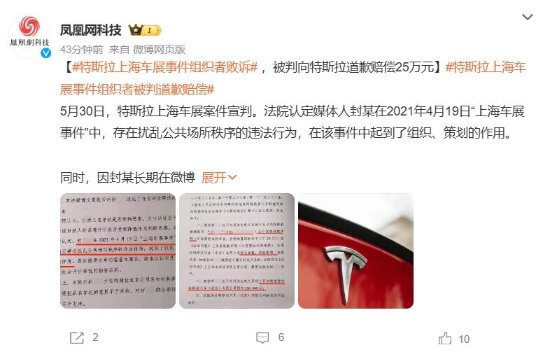 特斯拉上海车展事件组织者败诉 被判道歉赔偿25万元