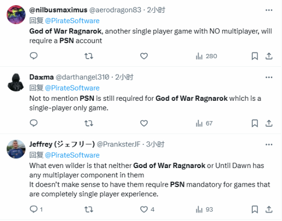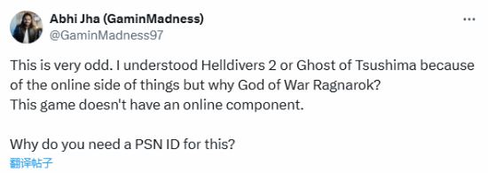 有玩家表示:“这太奇怪了。我理解《地狱潜者2》和《对马岛之魂》因为里面有与在线服务相关方面的事情导致它们需要绑定PSN,但《战神:诸神黄昏》是一款纯粹的单人游戏,为什么它也需要绑定PSN?”
