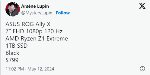 初代Ally Z1 Extreme芯片版本售价699美元,据透露新款Ally X售价为799美元(约5772元)。