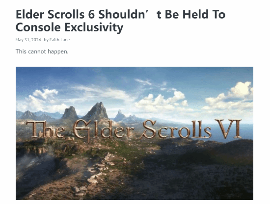 gameranx认为,《上古卷轴》是一项非常巨大的IP,它的新作不能只停留在Xbox与PC平台。这个IP的玩家社区相当庞大,如果《上古卷轴6》只登陆Xbox与PC平台的话,那么其所带来的坏处也会更多,因为不是每一位玩家都有PC或者主机。玩家们想玩自己喜欢的游戏,但如果游戏仅在某些被指定的平台上发售的话,那么肯定会对玩家们造成伤害,这可能会让微软和B社付出更多的代价。