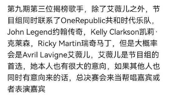 据大V爆料,《歌手2024》第九期第三位袭榜歌手大概率将是艾薇儿。