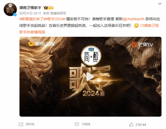 据湖南卫视官宣,下一期袭榜哥手将是断眉Charlie Puth。