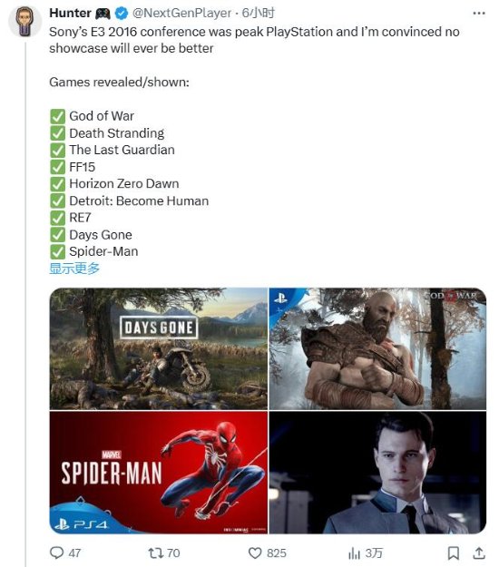 而这似乎也引发了一些玩家对索尼过去发布会的回忆,博主@NextGenPlayer表示,索尼2016年E3的发布会是PS的巅峰,认为没有比这更好的展示了。