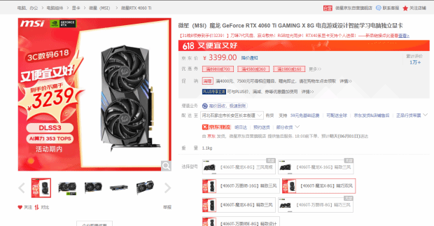 微星GeForce RTX 4060 Ti GAMING X 8G魔龙显卡的当前价格为3399元,今天晚8点开启京东秒杀,到手价格不超3239元。