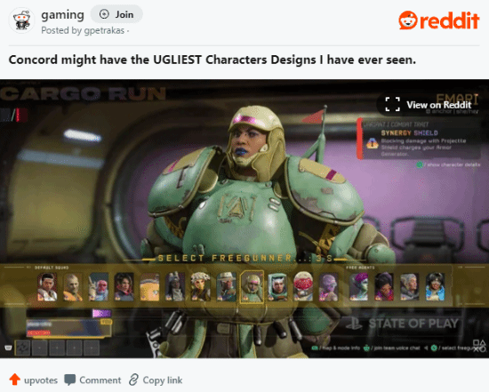 另一方面,《Concord》的角色设计也遭到了抨击,Reddit论坛有人发帖称游戏角色设计是他们见过的“最丑陋”的角色,并以可玩角色Emari举例,她穿着笨拙的盔甲,蓝色的口红也很奇怪。