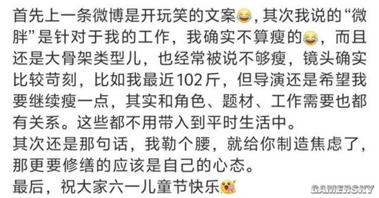 随后张馨予发文回应称,只是因为演员这个职业对身材有特殊的要求,确实上镜会比较显胖,很多女明星都是生活中清瘦,上镜刚刚好。