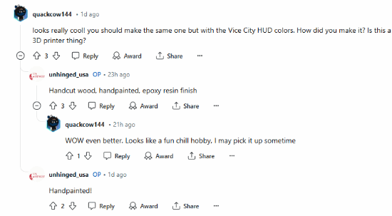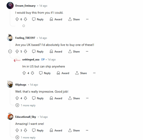 该玩家表示,这张桌子完全是自己手工制作。在Reddit论坛,玩家们纷纷对这张桌子的设计表达了赞美之情,也有玩家甚至表示想要购买这张桌子。