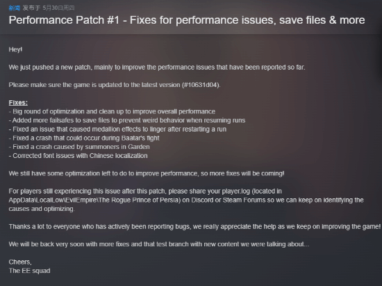 《波斯王子:Rogue》已于前几日在Steam平台正式开启了抢先体验,游戏目前在Steam平台中的评价为“特别好评”。目前,开发商Evil Empire正式发布了《波斯王子:Rogue》的首个更新补丁,该补丁主要改进了游戏的性能,并修复了各种bug,我们一起来看一下。