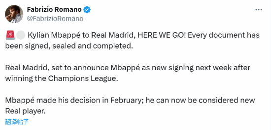 知名记者罗马诺透露,法国足球巨星姆巴佩将皇马。