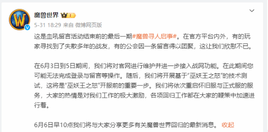 在此期间玩家可能无法完成登录与留言等操作。随后,官方将开展基于“巫妖王之怒”的技术测试,这将是“巫妖王之怒”开服前的重要一步,将依次重启怀旧服与正式服的服务。6月6日早10点将公布更多消息。