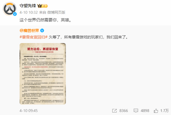 官方微博上次发文已经是4月10日暴雪官宣回归时,希望后续能为我们带来更多好消息。