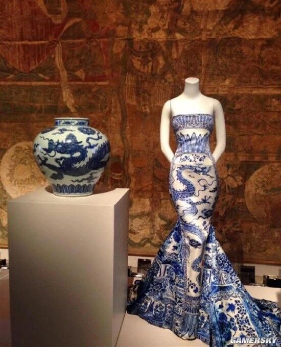 青花瓷瓶裙如古雅画卷舒展于身,素雅钴蓝,青花瓷韵。将瓷器元素融入服装中,以现代时装之美致以东方诗意与优雅,呈现典藏之作,尽显东方诗意。