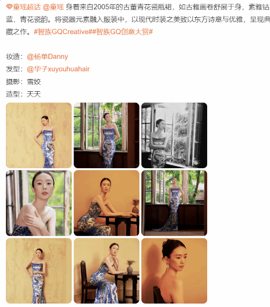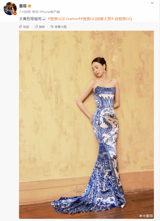 5月31日,在星光熠熠的智族GQ创意大赏上,童瑶以一身来自2005年的Roberto Cavalli秋冬系列中国风青花瓷裙,惊艳全场。