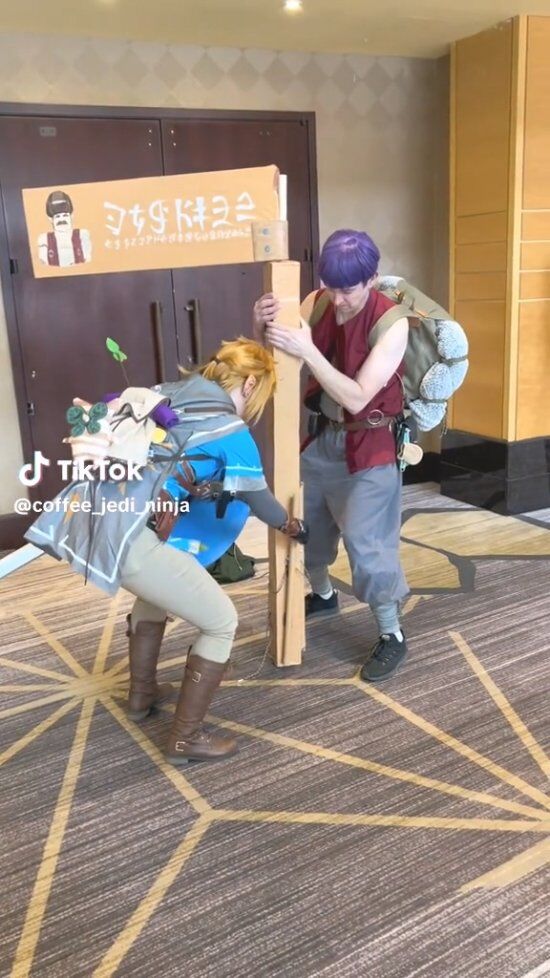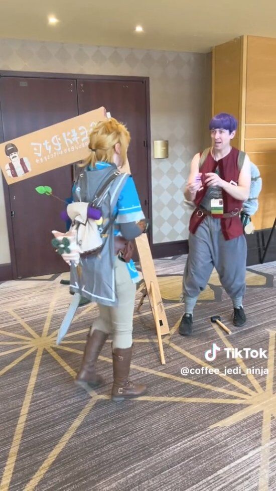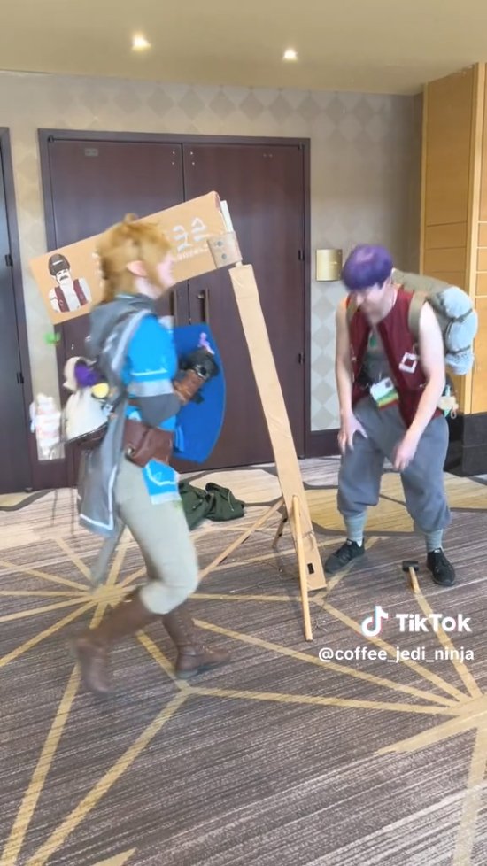Tiktok博主coffee_jedi_ninja就分享了其Cos卡邦达然后遇到了Cos林克的玩家帮其固定广告牌的视频。