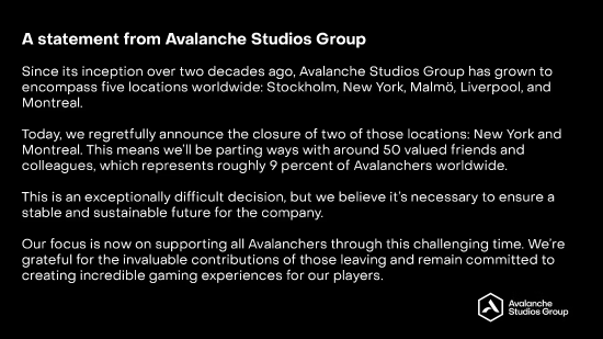 “成立20多年以来,Avalanche Studios Group已在全球五个地区开设工作室:斯德哥尔摩、纽约、马尔默、利物浦和蒙特利尔。今天,我们遗憾地宣布关闭其中两个地区的工作室:纽约和蒙特利尔,这意味着我们将与大约 50 位宝贵的朋友和同事分道扬镳,约占员工总数的9%。”