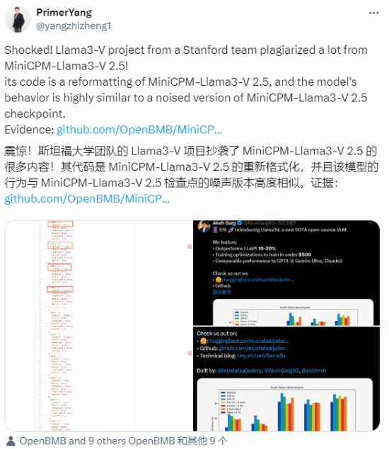 日前,斯坦福大学的AI研究团队的 Llama3-V 开源模型被指控抄袭了清华系明星创业公司面壁智能开发的开源模型“小钢炮”MiniCPM-Llama3-V 2.5,在网上引起热议,也迅速登上微博热搜第二名。