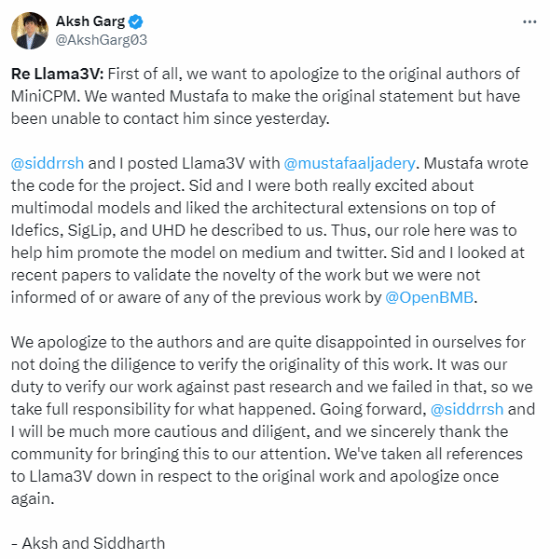 之后,斯坦福 Llama3-V 团队的两位作者 Siddharth Sharma 和 Aksh Garg 在社交平台 X 上对面壁 MiniCPM 团队就这一学术不端行为进行了正式道歉,并承诺将撤下所有 Llama3-V 模型。此前几小时,他们曾发布过一封类似内容的道歉信,但很快被删除。