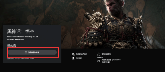 《黑神话:悟空》PSN商城页面有了新动向,港服官方游戏页面显示,游戏现已可加入愿望单。
