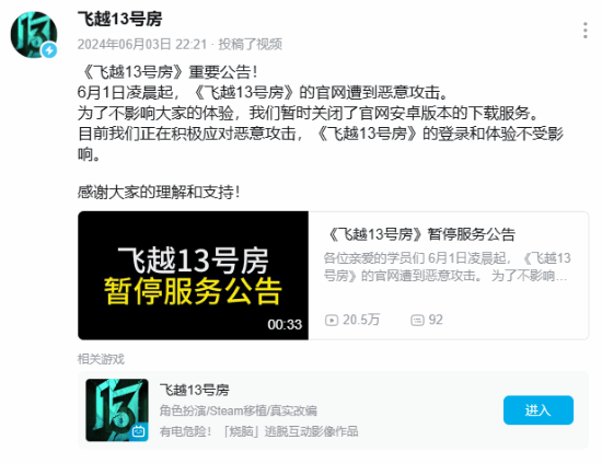互动影像叙事游戏《飞越13号房》今日针对几天前官网遭到恶意攻击的情况发布了重要公告,我们一起来看一下。