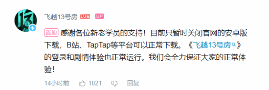 官方表示,为了不影响大家的体验,《飞越13号房》已暂时关闭了官网安卓版本的下载服务,但B站、TapTap等平台可以正常下载。目前官方正在积极应对恶意攻击,《飞越13号房》的登陆和体验不受影响。