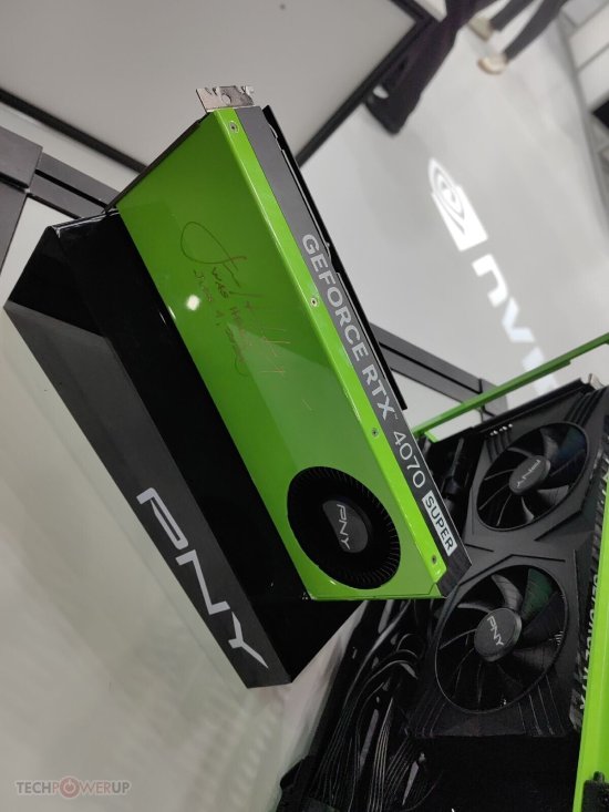 据techpowerup报道,在2024中国台北电脑展上,PNY的展区上摆放的一张GeForce RTX 4070 SUPER显卡吸引了不少发烧友以及英伟达首席执行官黄仁勋的关注。