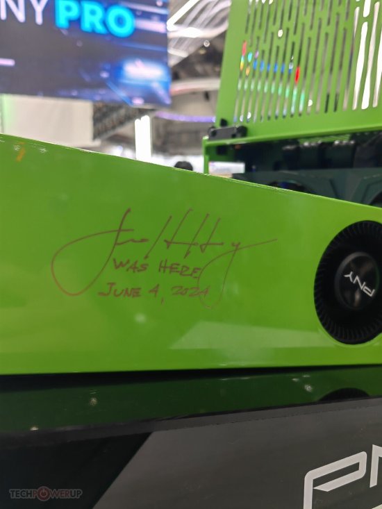 不同于单调的黑色配色方案,PNY的这款显卡色彩非常亮丽,整个外壳都覆盖着绿色。该卡采用了SFF小尺寸规格以及侧吹鼓风式的散热方案。这款显卡获得了黄仁勋的称赞,他还在上面签了名留念。