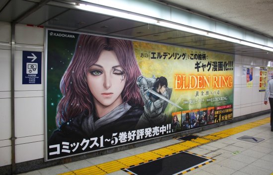 除了涩谷的户外广告牌外,FromSoftware还在东京地铁日比谷线秋叶原站出口3附近设立了另一处宣传点。6月3日至6月9日期间,通行的乘客将能看到《艾尔登法环:黄金树之路》(漫画)和《黑暗之魂:救赎》(漫画)的广告。