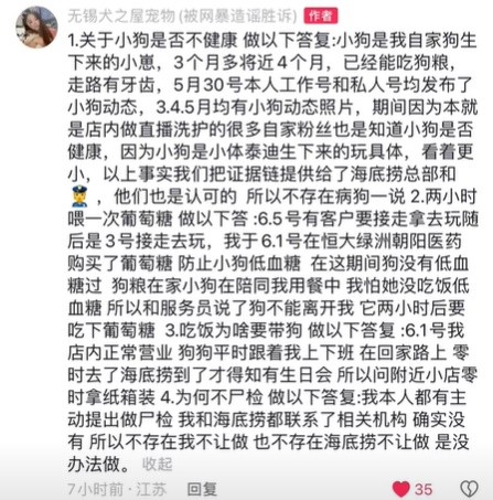 海底捞还表示,办公室非封闭空间,顾客及工作人员对室温均未有异常感知,小狗死亡具体原因还在进一步调查中。