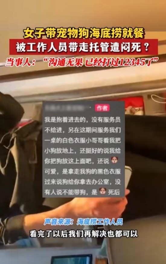网传一女子带宠物狗进海底捞火锅用餐,随后将狗交给服务人员,结果自己吃完饭去接狗时,发现门是紧闭的,狗在小屋里被活活热死。