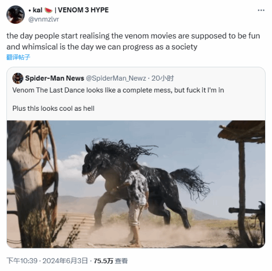 除此之外,预告片毒液马的出现也引起了很多影迷的热议。在评论区中,大部分网友对毒液变成马出现在影片中表示不满,认为毒液马在影片中的表现一团糟,但也有网友表示自己可以接受这一设定。
