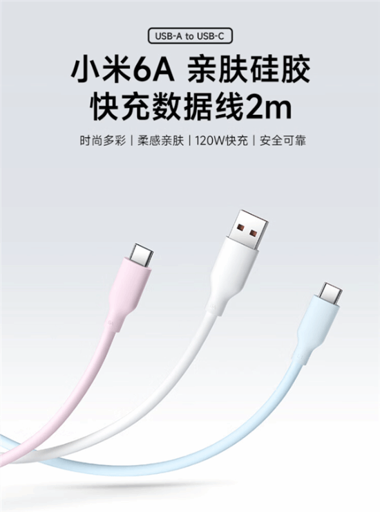 49元!小米6A硅胶数据线开卖:支持120W快充