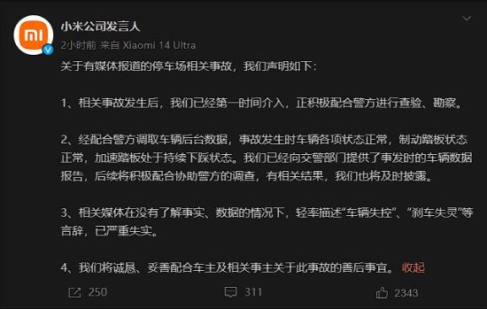 小米公司今日发文,对相关媒体报道的停车场相关事故做出了声明回应。