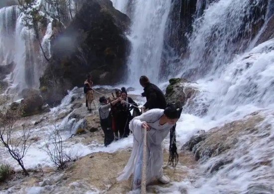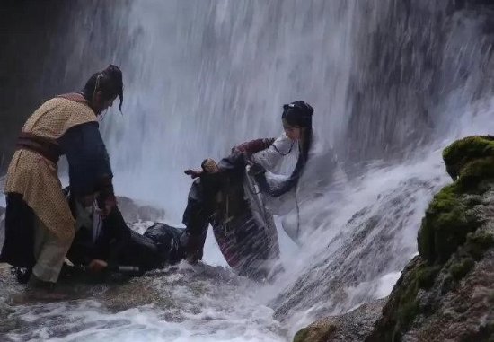 这场戏是在九寨沟拍的,拍戏的时候正值隆冬,瀑布里流的是雪水,刘亦菲根据拍摄要求站在冰冷的水中,立刻就冻僵了,滑到激流里,顿时就窒息了。刘亦菲回忆说:“黄晓明特别好,那时候他自己也冻得不行了,拉了我一把,把我拉起来,有难同当。”