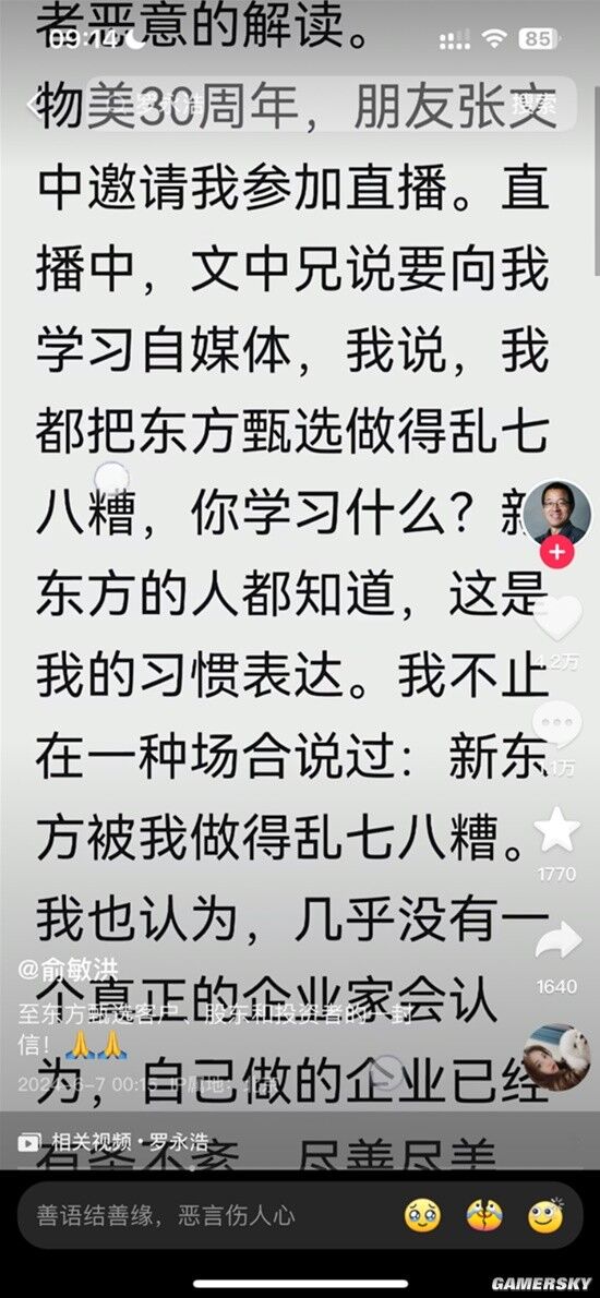 6月7日凌晨,新东方创始人俞敏洪发布长文,就对近日在直播中发表的“东方甄选做得乱七八糟”“后面会稍微远离生意,不喜欢在生意中打拼了”等争议言论,进行了回应。