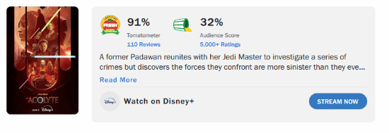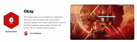 目前《星球大战:侍者》的烂番茄新鲜度为91%,IGN评分为6分。