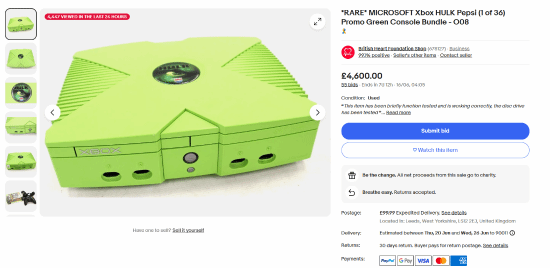 微软在2001年推出了Xbox初代,并在随后的日子里与索尼的PS2、任天堂的NGC形成了三足鼎立的局面,其在游戏史上有着非常重要的地位。近日,一台以《绿巨人》电影为主题的限量版Xbox初代主机出现在eBay上,拍卖所得的所有收益将捐给英国心脏基金会慈善机构。截至发稿前,目前的拍卖价格已飙升至4600英镑(约合5852美元、42416元人民币),共有55人参与了出价,我们一起来看一下。